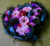 Gesteck aus Gerbera, Rosen, Statitien, Mumies und Schmuckband